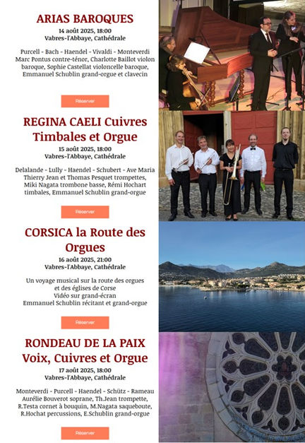 13 août 2026, 18:00Vabres-l'Abbaye, CathédraleLa vie de Saint François d'Assise en musique à l'occasion du Jubilé du 8e centenaire de son Transitus Danses de la Renaissance - Marcello - Bach - Frescobaldi - Daquin - Delalande Récitant Trompette Orgue Percussions et Appeaux Rémi Hochart percussions Thierry Jean trompette Emmanuel Schublin orgue